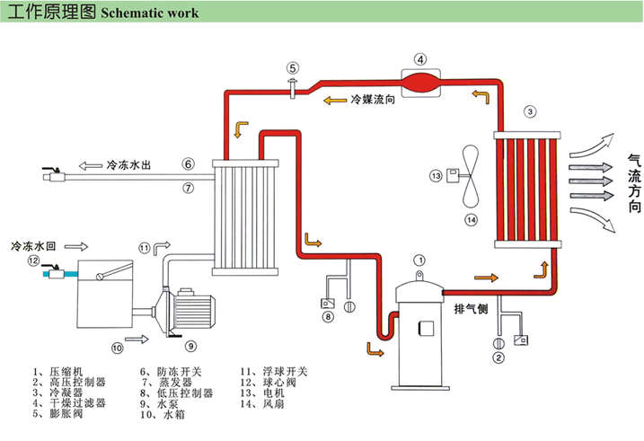 風(fēng)冷式工業(yè)冷凍機(jī)組技術(shù)資料之工作原理圖如下
