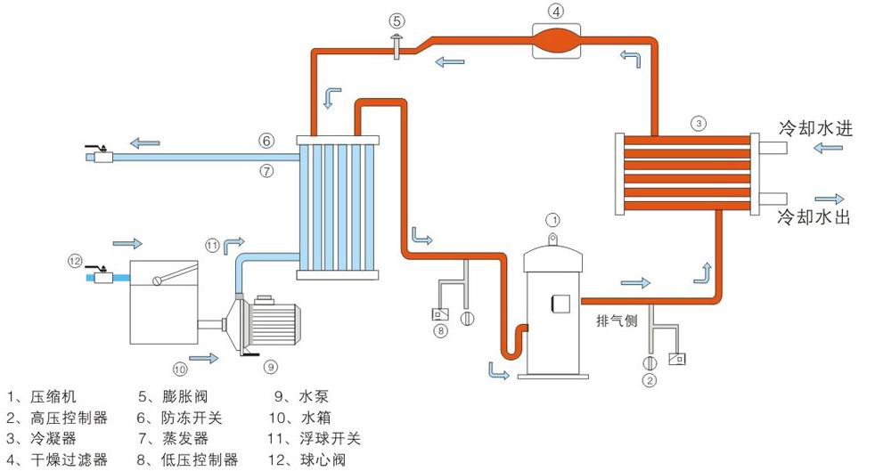 其中應(yīng)用非常廣泛的單元設(shè)備是制冷機(jī)組,將一臺(tái)或數(shù)臺(tái)制冷壓縮機(jī)、水泵,風(fēng)扇電機(jī)、控制器、冷凝器、蒸發(fā)器、干燥過(guò)濾器、節(jié)流裝置、配電柜、能量調(diào)節(jié)機(jī)構(gòu),以及各種安全保護(hù)設(shè)施,全部組裝在一起,可提供4~40℃低溫冷水的單元設(shè)備稱(chēng)為循環(huán)水冷凍機(jī)組。
